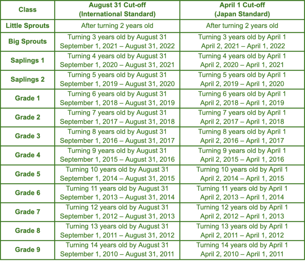 | Grade1 [ 2 classes ] | 18-22 students / class at KB | 14 students / class at KB & TS |
